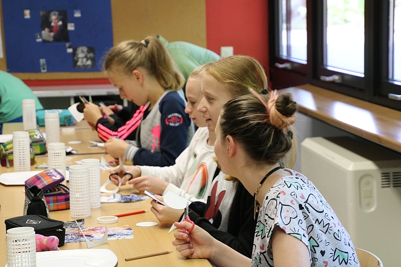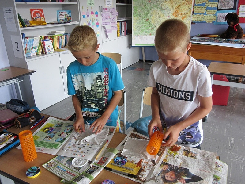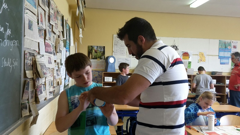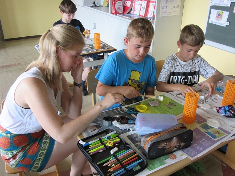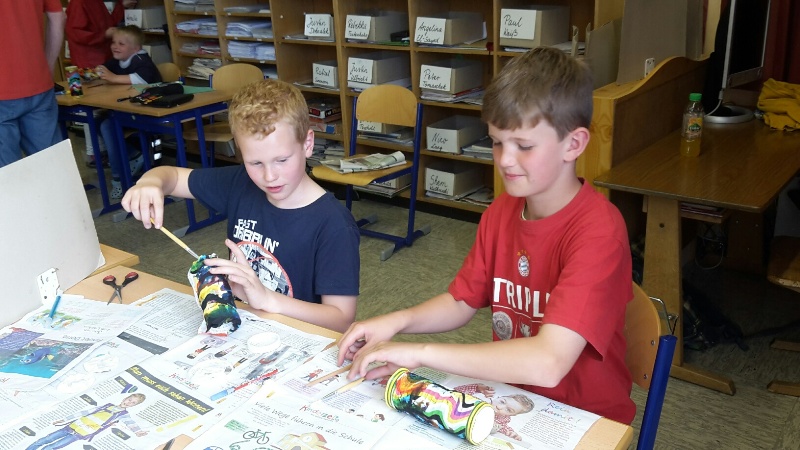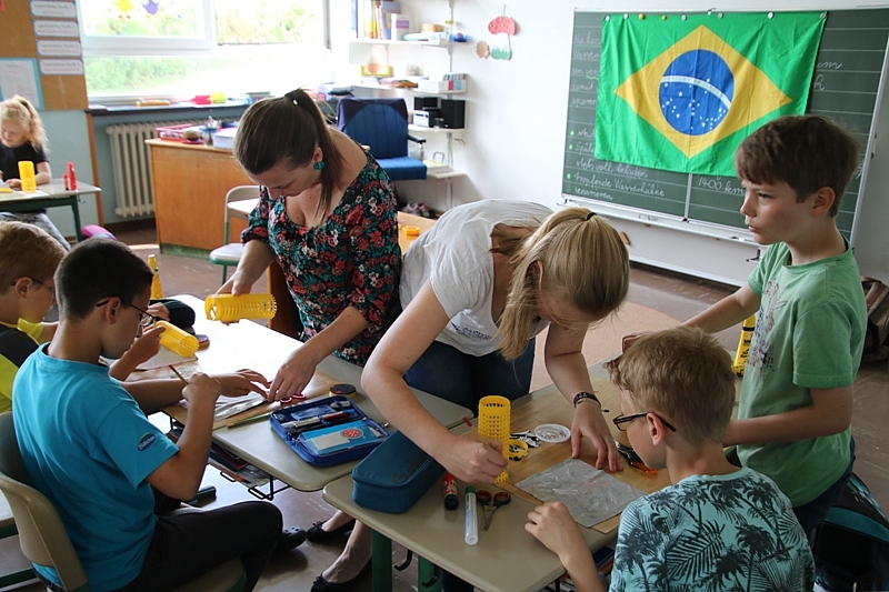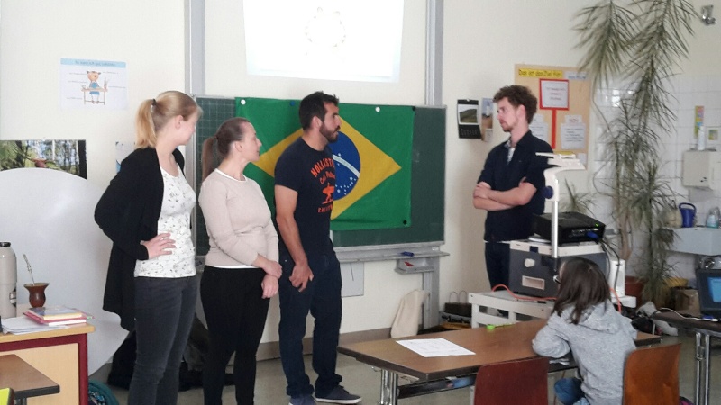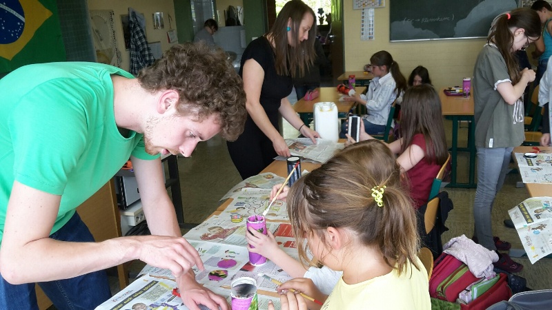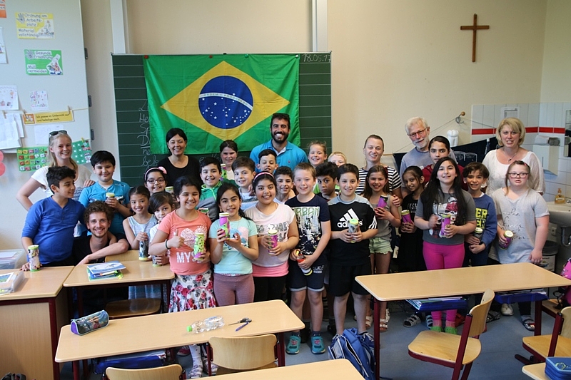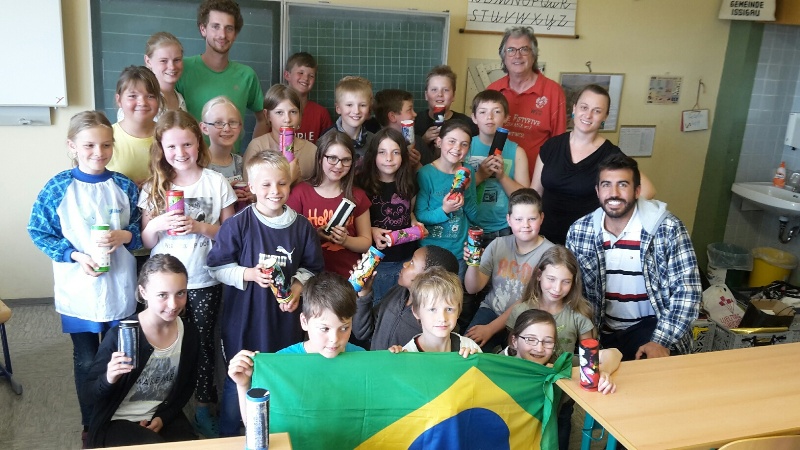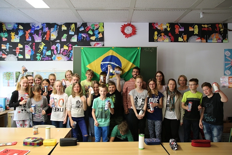 Seit Anfang Mai besuchen Sie zusammen mit unserer Abfallberatung Schulen. Zu Beginn des außergewöhnlichen Unterrichtes zeigen die Stipendiaten den Schülerinnen und Schülern viele Bilder vom Amazonas, den Tieren, Städten und Sehenswürdigkeiten ihres Landes. Daneben werden auch Themen wie der Umgang mit Müll in Brasilien und Deutschland, die Probleme die durch Müll entstehen und was jeder Einzelne dagegen tun kann, diskutiert. Im Anschluss spielen die Kinder in Gruppen ein Memory mit typischen Tieren aus Brasilien, dass die Stipendiaten selbst entwickelt hatten. Praktisch arbeiteten die Kinder beim Bau einer Rassel, brasilianische genannt „Chocalho“, aus Müll, Abfall und Wertstoffen. Verziert wird jede „Chocalho“ mit alten Stoffresten. Zu brasilianischer Musik können die Kids ihre Instrumente ausprobieren.