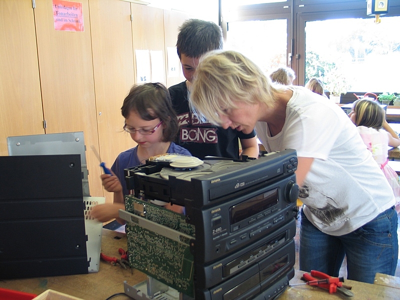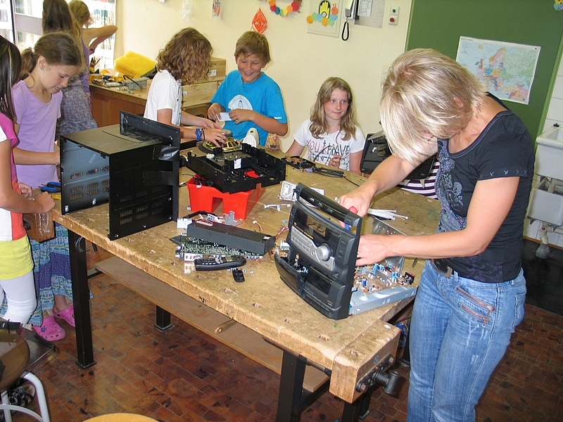 Jede vierte Klasse durfte zum Abschluss des Schuljahres an der Aktion „Schraubertonne“ teilnehmen, bei der alte Elektrogeräte mit verschiedenen Werkzeugen auseinander gebaut werden und das Innenleben erforscht wird.