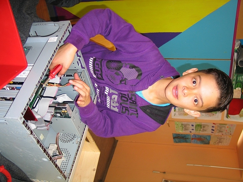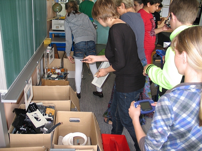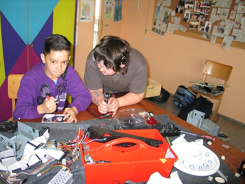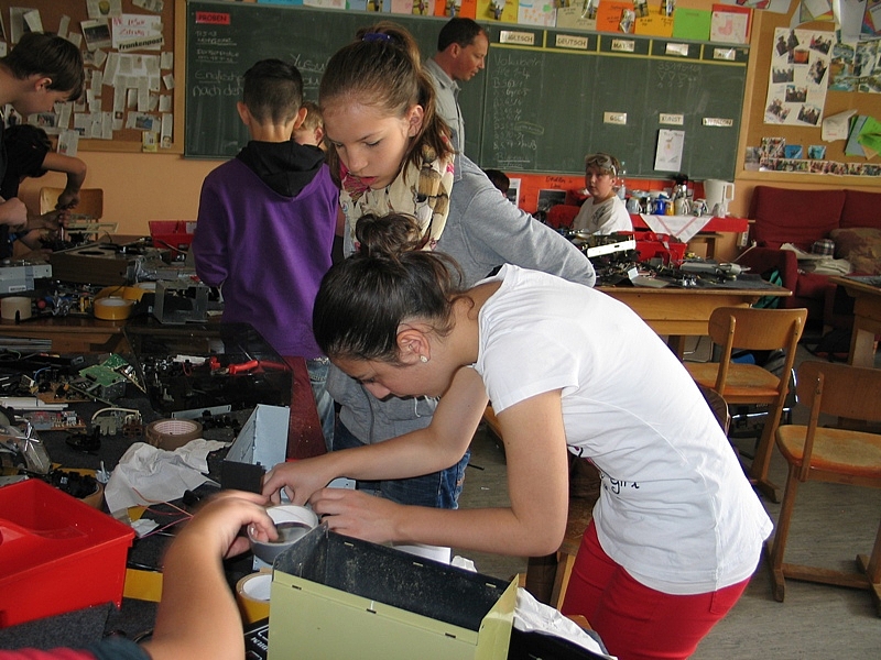 Im Mai 2013 haben wir die Klasse 6 AG der Münsterschule Hof mit unserer „Schraubertonne“ besucht. Im ersten Abschnitt haben wir alte Elektrogeräte zerlegt und nach „wertvollen“ Dingen untersucht. Und waren fündig: Gold! Im zweiten Abschnitt war Kreativität gefragt. Aus den zerlegten Geräten entstanden interessante, schöne und zum Teil funktionstüchtige Werke. Wir hatten alle großen Spaß!
