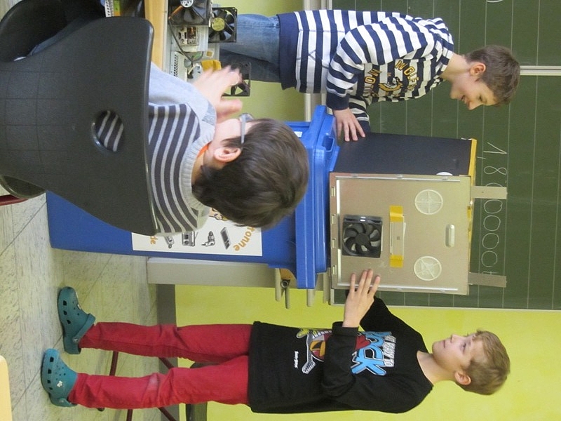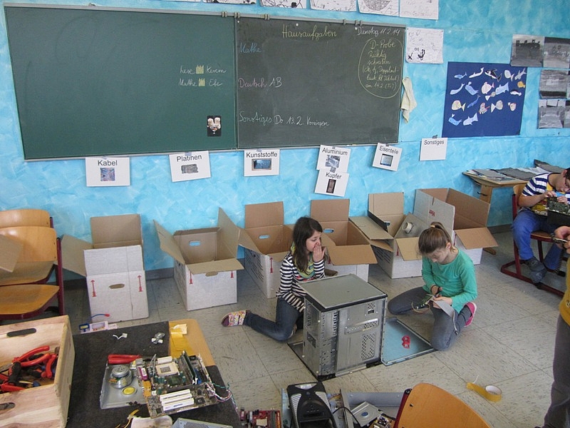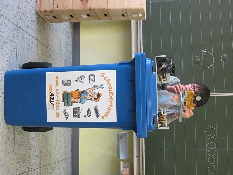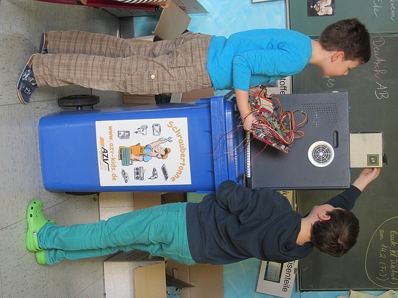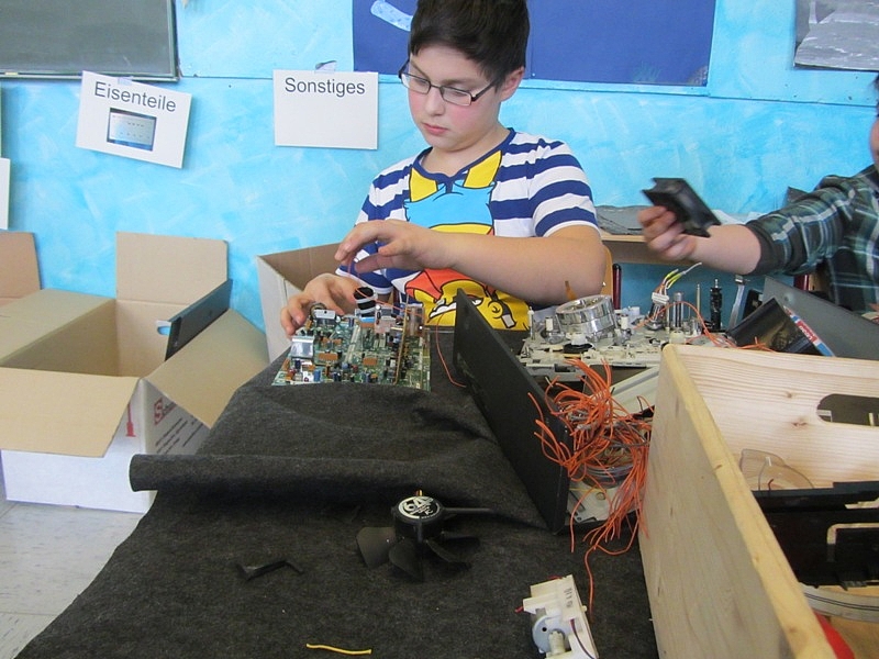 In der zweiten Aktion zerlegten die Kinder alte Elektrogeräte vom Wertstoffhof oder welche, die sie selbst mitgebracht hatten. Ausgerüstet mit Schraubenziehern, Seitenschneidern und Schutzbrillen zerlegten die Schüler und Schülerinnen die Geräte bis aufs kleinste und fanden darin Aluminium, Eisen, Kunststoff, Holz und sogar echtes Gold! Nach einer kurzen Lerneinheit von Frau Popp-Köhler waren sich alle einig, dass man durch das Abgeben dieser Geräte am Wertstoffhof wertvolle Rohstoffe einsparen kann. Mit Kabelbindern, Draht und doppelseitigem Klebeband konstruierten die Kinder danach "Kunstwerke", wie zum Beispiel Roboter, ein Hotel, einen Freizeitpark und vieles mehr.