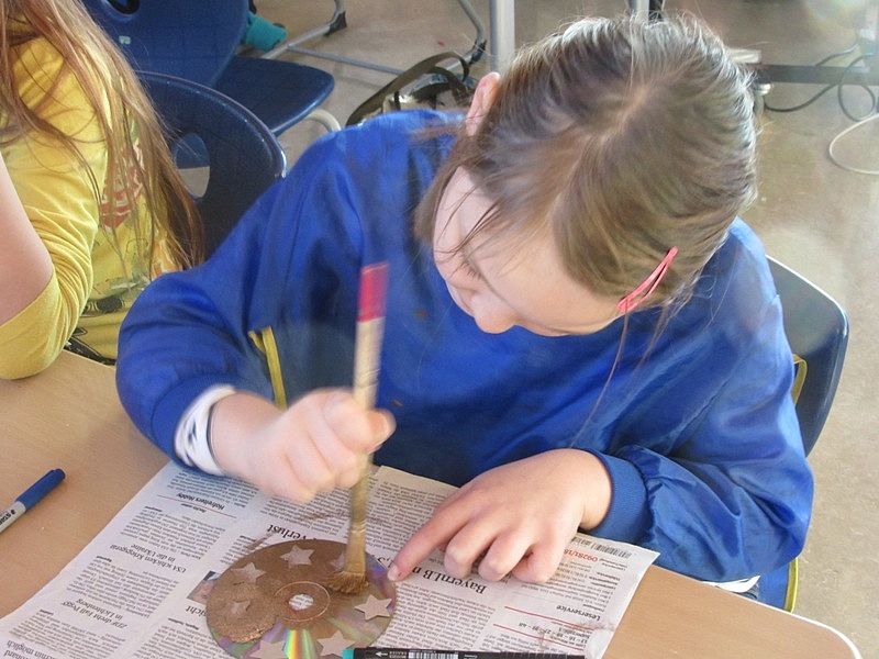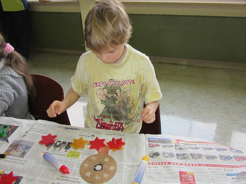Frau Cornelia Angermaier mit der Klasse 3c, Frau Susanne Augustin mit der Klasse 4a und Frau Egeter-Hahn mit der Klasse 4b gestalteten aus alten CD´s und Kerzenwachsresten vom Wertstoffhof wunderschöne weihnachtliche Sternenkerzen.