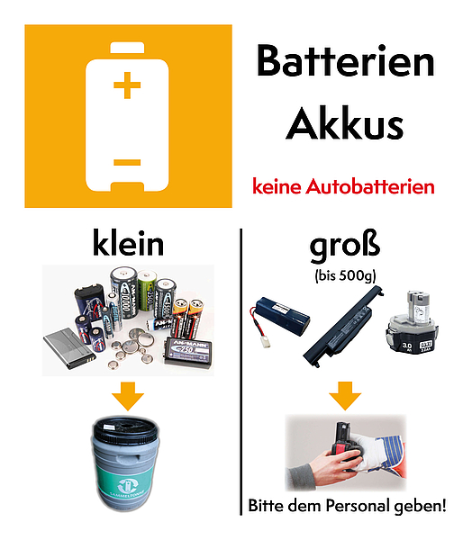 Unbeschädigte Trockenbatterien und Akkus bis zu einem Gewicht von 500 g/Stck. können von Privat an allen Wertstoffhöfen, Wertstoffmobilen und bei der Problemabfallsammlung abgegeben werden. Die Annahme ist kostenfrei. An den Wertstoffhöfen im Landkreis Hof und am Wertstoffmobil werden nur haushaltsübliche Mengen angenommen (bis zu 10 Liter). Im Wesentlichen wird zwischen „klein“ und „groß“ unterschieden, wie die nachfolgende Grafik zeigt.