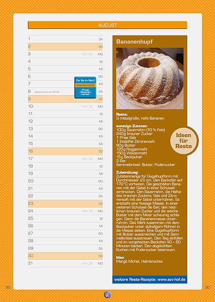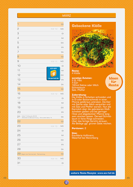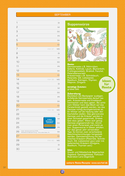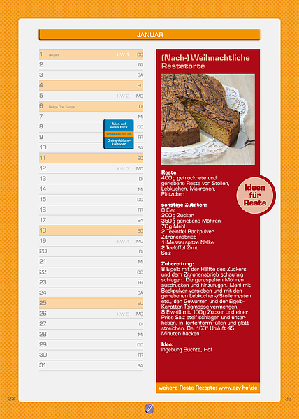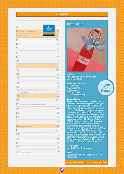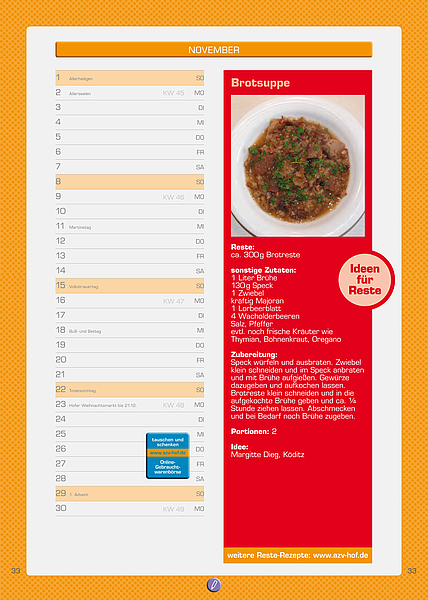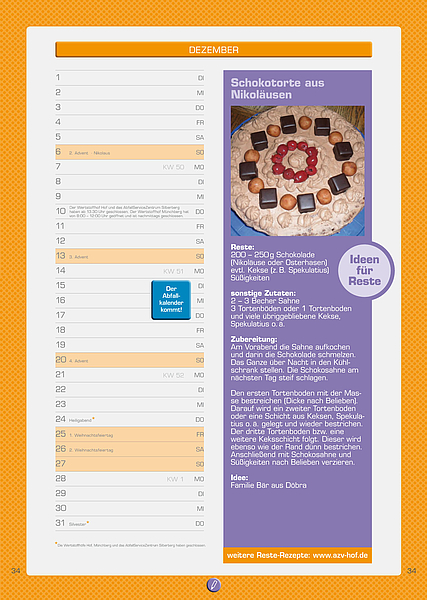 Die 12 Gewinner erhielten bei der Preisverleihung im Landratsamt Hof durch AZV-Verbandsvorsitzenden Landrat Dr. Oliver Bär und den stellvertretenden AZV-Verbandsvorsitzenden Oberbürgermeister Dr. Harald Fichtner das Preisgeld von je 100 €. Darüber hinaus schmücken die prämierten Rezeptideen das Kalendarium des Abfallkalenders 2015 . Die Rezeptvorschläge reichen von altbewährten Speisen wie "Brotsuppe" und "Gebackene Klöße" bis zur "Weihnachtlichen Restetorte" aus übrig gebliebenen Stollen und Lebkuchen.