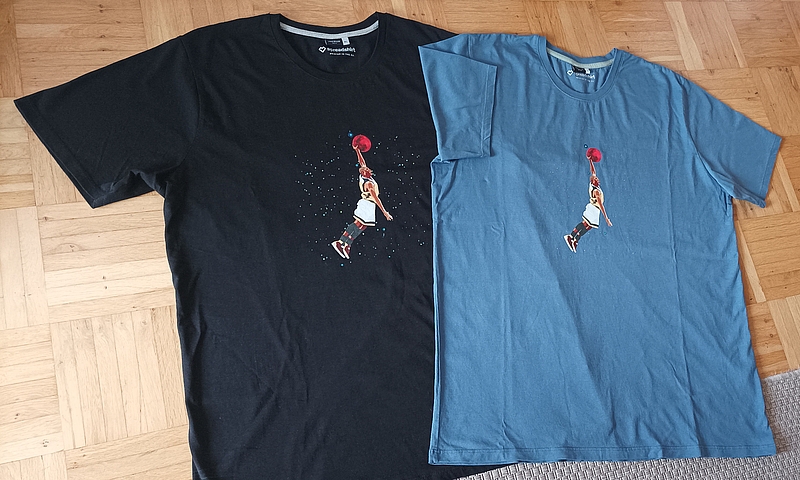 Premium, 100% Baumwolle, 1x schwarz, 1x graublau. Die Shirts sind nicht getragen, da die Größen zur Auswahl bestellt wurden. Neupreis war 28,99 €/Shirt. Ich möchte gerne tauschen gegen eine Kiste Bionade/Shirt oder Ähnliches.