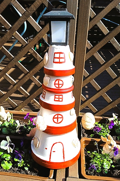 selbstgebastelter Leuchtturm aus Terracotta Blumentöpfen mit Solar Laterne und echten Muscheln verziert, ca. 45 cm hoch zum Tausch gg 1 Kasten Kulmbacher Edelherb