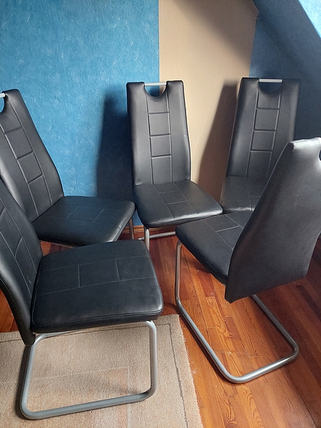 5 Küchenstühle, schwarzes Kunstleder, max. Belastung 120 kg für einen Kasten Scherdel alkoholfreies Bier zu tauschen.