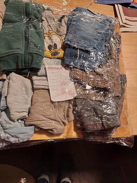 Gut erhaltene Kinderkleidung. 3 Hosen, 3 T-Shirt, 1 Hemd, 1 Pullover, 1 Sweatjacke, 2 Bodys für Jungen. Zu tauschen für einen Malblock und Malkasten.