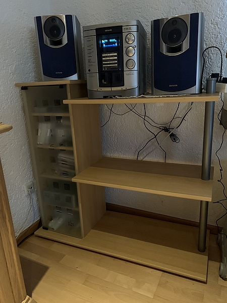 Mit leichten Gebrauchsspuren, ohne Deko, Breite 105 cm, Höhe 87/97 cm, Tiefe 40 cm. Die Stereoanlage wäre zum Tauschen. Nichtraucherhaushalt
