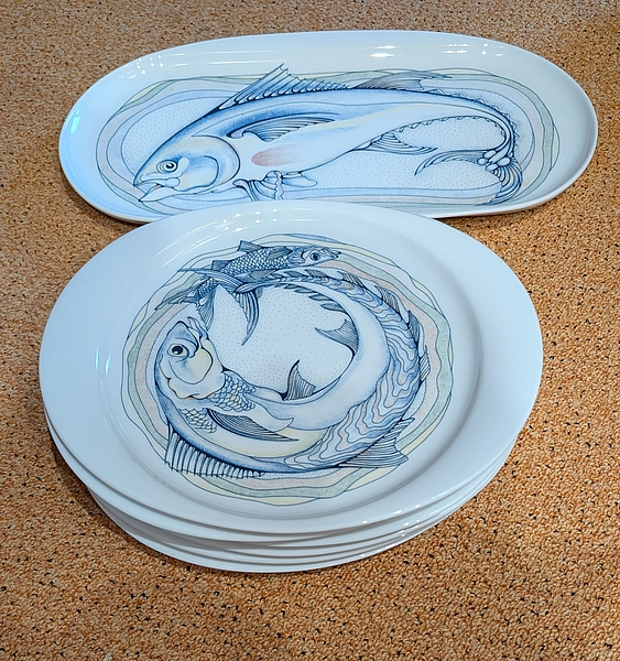 6 Pozellanteller (ovale Form) und eine Platte mit Fischmotiv