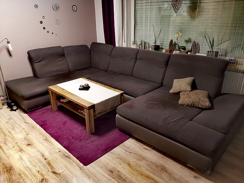 großes Schlafsofa in U-Form aus Stoff mit ausziehbarem Mittelteil. Gut erhalten bis auf Kratzspuren von der Katze an 2 Ecken. Kopfteile an den Rückenlehnen verstellbar. Maße : Breite 3,70m x langes Seitenteil 2,20m, Ottomane 1,50m lang