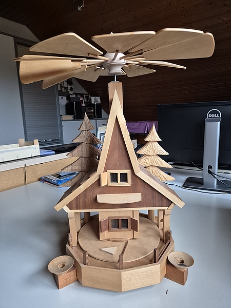 Zu verschenken ist eine Weihnachts - Pyramide für Bastler. Bei der Pyramide müssen noch einige Teile gerichtet werden, z.B. der Aufsatz ist tiefer zu bohren. Auch sind noch Kleinteile zu verkleben. Die Pyramide ist ca. 60 cm hoch u. ca. 30 cm im Durchmesser.
