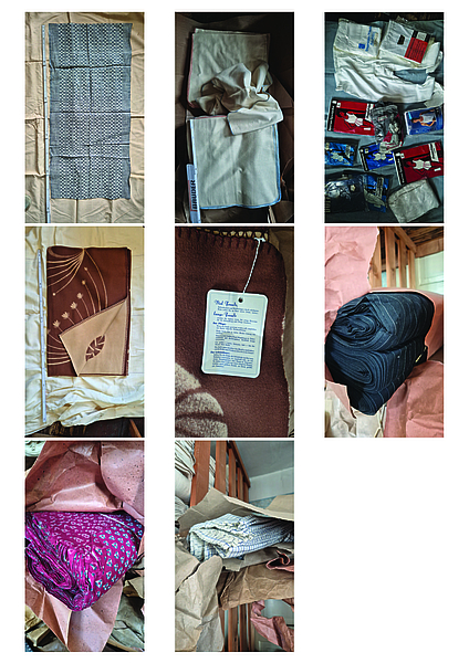 Küchenhandtuchzuschnitte (ca. 95x45cm, ungesäumt), Stoffwindeln (ca. 75x75 cm), Herren-Feinrippunterwäsche, Baumwolldecken, verschiedene Stoffballen, zu verschenken. Alles aus den 1970er / 1980er Jahren, teilweise mit Lagerspuren. Nachlass aus ehemaliger Hausweberei / Einzelhandelstätigkeit in Helmbrechts. Abholung in Helmbrechts.
