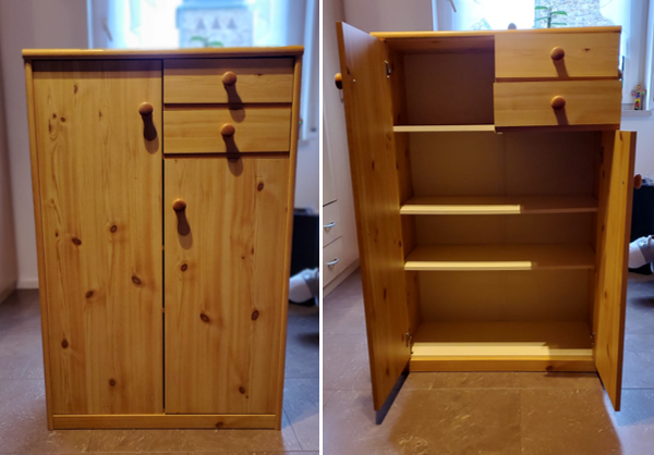 kleiner Schrank, gebraucht, gut erhalten, Einlegeböden, 2 Schübe Maße: Höhe: 110cm, Breite: 72cm, Tiefe: 36cm gegen Selbstabholung zu verschenken